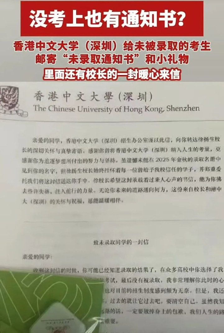 近日,据深圳新闻网报道,有网友发布视频称,自己虽然未能考入香港中文大学(深圳),却意外收到了该校寄来的一份“未录取通知书”,内含一封徐扬生校长的亲笔信和一个印有该校校徽的精美小礼物。有网友调侃:“别人家的大学,连拒绝都这么有仪式感!”也有网友质疑这是多此一举:“让人白高兴一场,感觉像二次伤害。”“有点‘扎心’的关怀,收到可能更难受了。”